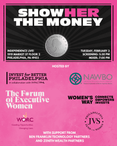 Join Invest For Better Philadelphia, NAWBO Philadelphia, The Forum of Executive Women, WORC, and WOMEN’S WAY — along with their members and friends — for an inspiring evening centered on Show Her The Money, the 2023 documentary highlighting the realities and opportunities women face in investing and funding.